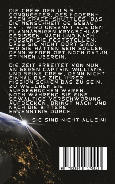 Die Crew der U.S.S. Conquester, des modernsten Space-Shuttles, das die Menschheit je gebaut hat, wird unsanft aus dem Planmäßigen Kryoschlaf gerissen. Nach und nach müssen sie feststellen, dass sie nicht dort sind, wo sie hätten sein sollen. Denn weder Ort noch Datum stimmen überein.Die Zeit arbeitet von nun an gegen Captain Williams und seine Crew, denn nicht einmal das Ziel ihrer Mission schien das zu sein, zu welchem sie aufgebrochen waren. Noch während sie eine gewaltige Verschwörung aufdecken, dringt nach und nach die bittere Erkenntnis durch...Sie sind nicht allein!