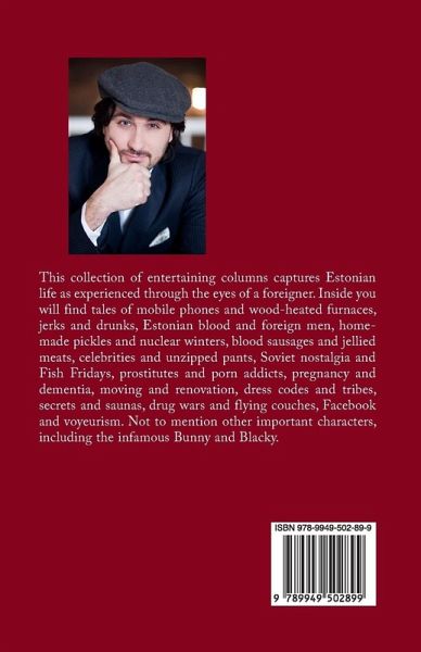 This collection of entertaining columns captures Estonian life as experienced through the eyes of a foreigner. Inside you will find tales of mobile phones and wood-heated furnaces, jerks and drunks, Estonian blood and foreign men, homemade pickles and nuclear winters, blood sausages and jellied meats, celebrities and unzipped pants, Soviet nostalgia and Fish Fridays, prostitutes and porn addicts, pregnancy and dementia, moving and renovation, dress codes and tribes, secrets and saunas, drug wars and flying couches, Facebook and voyeurism. Not to mention other important characters, including the infamous Bunny and Blacky.