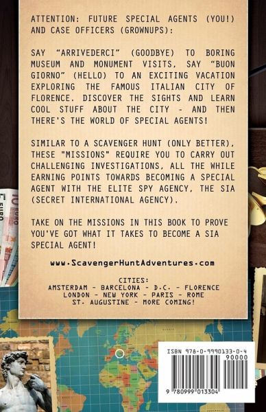Headed to Florence with kids? Want to ensure your young explorers get the most out of their incredible opportunity to experience this Tuscan treasure? Then you've come to the right place! Mission Florence takes your young travelers through the famous sights of Florence, engaging them in an exciting scavenger hunt as you explore city landmarks together. Say "arrivederci" to a trip filled with the stress of keeping everyone entertained. Instead, say "buon giorno!" to a memorable family vacation. Imagine - your kids will be excited to sightsee (yes, even at museums!) as you discover the wonders of Florence as a family. Get Mission Florence today for your young jet-setters…and make sure it’s in their bag when they take off for Italy! Mission Florence offers a fun vacation for everyone - with a captivating, spy-theme scavenger hunt packed with entertaining activities. When your kids set off on their "mission," with the goal of earning enough points to become a "special agent," they’ll gain points as: -Art Sleuths: They’ll search for clues in the treasures of the Uffizi , Accademia, and Bargello. -Culture Detectives: They’ll discover the fascinating stories behind landmarks like Santa Maria del Fiore and Piazza Signoria, and sample Italian treats like gelato and gourmet pizza. -Monument Investigators: They’ll uncover clues on the façade of the Palazzo Vecchio, the square of the towering Duomo, and the details of the Ponte Vecchio…and many more engaging activities. Experiencing this Renaissance wonder is an amazing opportunity for anyone, especially a young person. Make your kids’ trip one to remember. Get Mission Florence today for your young explorers…and be sure it’s in their suitcase when they set off for Italy! Our series also includes books for Rome, Paris, London, Barcelona, Amsterdam, Washington, D.C., New York, and St. Augustine.