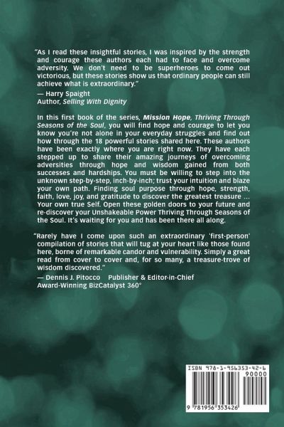 This collection of personal and professional stories is written from the heart, by everyday people just like you. They will make you laugh and make you cry. Above all, it will give you more confidence and strength to confront your own adversities in life, and to know, you're not alone. The authors of Mission Hope have been where you are right now. They want you to know, if they can go through it and come out better, more empowered and on the other side of what feels like a total disaster, you can do it too. A new season of hope is coming soon. Please meet the 18 very talented and inspirational authors of Mission Hope: Babien Avila Johanna Baker Jennifer Bassett Destiny Bogan Brad Burchnell Minnku Buttar Matthew Dickson Kathleen Dutton Curtis Gregor Maria Lehtman Susan LePlae Miller Karen Ortega Jean L. Serio Todd George Stone M.L. Sutton Dr. Jo Anne White Ipek Williamson Tracey S. Yang Introduction by Char Murphy