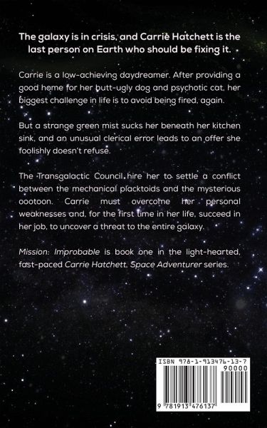If you like Dr. Who, you'll love Mission Improbable. Carrie Hatchett’s been a dog walker, ice cream seller and birthdaygram girl—the clean kind. All she wants is a proper job. But Transgalactic Intercultural Community Crisis Liaison Officer isn’t what she had in mind. And neither is saving the galaxy. Carrie's a low-achieving daydreamer. After providing a good home for her butt-ugly dog and crazy cat, her biggest challenge in life is to avoid being fired, again. But a strange green mist sucks her beneath her kitchen sink, and an unusual clerical error leads to an offer she foolishly doesn’t…mehr