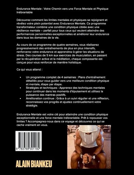Endurance Mentale : Votre Chemin vers une Force Mentale et Physique Inébranlable Découvrez comment les limites mentales et physiques se rejoignent et révélez votre plein potentiel avec Endurance Mentale. Ce programme transformateur combine une condition physique ciblée avec une résilience mentale - parfait pour tous ceux qui veulent atteindre des performances personnelles exceptionnelles et améliorer leur endurance dans tous les domaines de la vie. Au cours de ce programme de quatre semaines, vous réaliserez progressivement des entraînements de plus en plus intensifs, renforcerez votre endurance et apprendrez à gérer les situations de stress. Des courses de 5 km aux exercices de musculation, en passant par la récupération active et la méditation, chaque composante est conçue pour vous renforcer de manière holistique. Ce qui vous attend : Un programme complet de 4 semaines : Plans d'entraînement détaillés pour vous guider vers une meilleure condition physique et mentale, étape par étape. Stratégies et techniques : Apprenez des techniques mentales pour continuer dans les moments d'épuisement et utilisez la puissance des mantras positifs. Amélioration continue : Grâce à un suivi régulier et une réflexion, reconnaissez vos progrès et ajustez continuellement votre stratégie. Endurance Mentale est votre clé pour atteindre une condition physique exceptionnelle et une force mentale inébranlable. Prêt à repousser vos limites ? Accompagnez-nous dans ce voyage et découvrez ce qui se cache vraiment en vous.