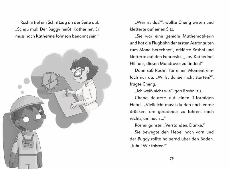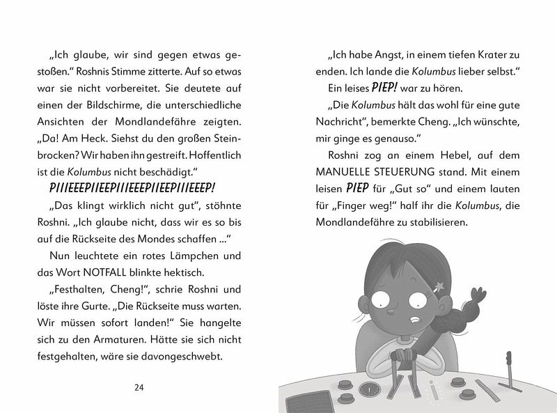 Im 9. Band der Kinderbuch-Reihe führt eine streng geheime Mission die Forscher-Kids Roshni und Cheng in den Weltraum, wo sie einen Mondrover aus einem tiefen Krater bergen müssen. Doch schon bei der holprigen Landung auf dem Mond geht die Mondfähre Kolumbus kaputt. Können die Forscher-Kids ihre Mission fortsetzen und den Rover befreien?