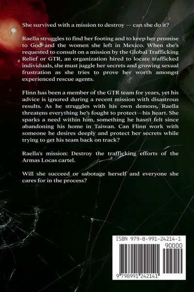 She survived with a mission to destroy - can she do it? Raella struggles to find her footing and to keep her promise to God and the women she left in Mexico. When she's requested to consult on a mission by the Global Trafficking Relief or GTR, an organization hired to locate trafficked individuals, she must juggle her secrets and growing sexual frustration as she tries to prove her worth amongst experienced rescue agents. Flinn has been a member of the GTR team for years, yet his advice is ignored during a recent mission with disastrous results. As he struggles with his own demons, Raella threatens everything he's fought to protect-his heart. She sparks a need within him, something he hasn't felt since abandoning his home in Taiwan. Can Flinn work with someone he desires deeply and protect her secrets while trying to get his team back on track? Raella's mission: Destroy the trafficking efforts of the Armas Locas cartel. Will she succeed or sabotage herself and everyone she cares for in the process?