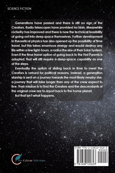Generations have passed and there is still no sign of the Creators. Radio telescopes have provided no hints. Meanwhile rocketry has improved and there is now the technical feasibility of going out into deep space themselves. Further development in theoretical physics has also opened up the possibility of time travel, but this takes enormous energy and would destroy any life within a few light-hours, a radius the size of their Solar System. Even if the time travel option of going back to the First Parents is adopted, that will still require a deep-space capability as one of the steps. Eventually the option of sliding back in time to meet the Creators is vetoed for political reasons. Instead, a generation starship is sent on a journey towards the most likely nearby star, a journey that will take longer than any of the crew expect to live. Their mission is to find the Creators and the descendants of the original crew are to report back to the home planet. The mission finds Earth more than a thousand years after the runaway Greenhouse Effect has destroyed civilisation, and humans have been reduced back to migratory herding in northern Siberia. The Argo decides to slide back in time to prevent this disaster, but learns that this can't be done. Instead, they discover the Creators themselves were an engineered species. They slide back even further, only to discover that they themselves created the Creators.