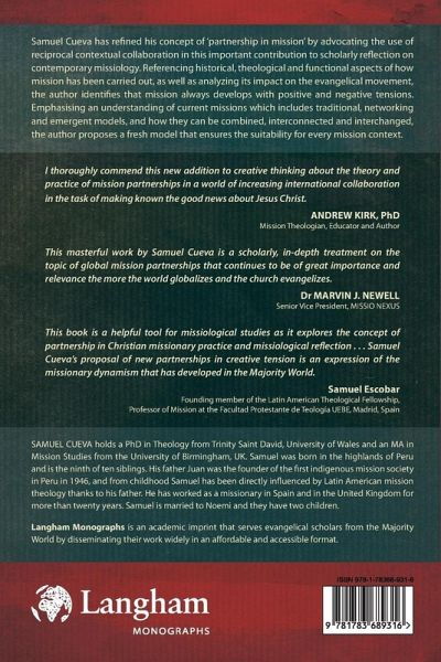 Samuel Cueva has refined his concept of 'partnership in mission' by advocating the use of reciprocal contextual collaboration in this important contribution to scholarly reflection on contemporary missiology. Referencing historical, theological and functional aspects of how mission has been carried out, as well as analyzing it's impact on the evangelical movement, the author identifies that mission always develops with positive and negative tensions. Emphasizing an understanding of current missions which include traditional, networking and emergent models, and how they can be combined, interconnected and interchanged, the author proposes a fresh model that ensures the suitability for every mission context.