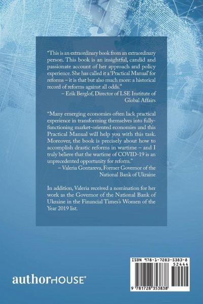 "This is an extraordinary book from an extraordinary person. This book is an insightful, candid and passionate account of her approach and policy experience. She has called it a 'Practical Manual' for reforms - it is that but also much more: a historical record of reforms against all odds." - Erik Berglof, Director of LSE Institute of Global Affairs "Many emerging economies often lack practical experience in transforming themselves into fully-functioning market-oriented economies and this Practical Manual will help you with this task. Moreover, the book is precisely about how to accomplish drastic reforms in wartime - and I truly believe that the wartime of COVID-19 is an unprecedented opportunity for reform." - Valeria Gontareva, Former Governor of the National Bank of Ukraine In addition, Valeria received a nomination for her work as the Governor of the National Bank of Ukraine in the Financial Times's Women of the Year 2019 list.