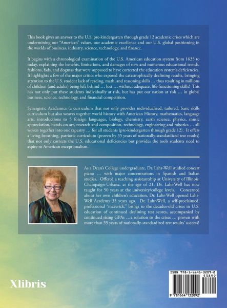 This book gives an answer to the U.S. pre-kindergarten through grade 12 academic crises which are undermining our "American" values, our academic excellence and our U.S. global positioning in the worlds of business, industry, science, technology, and finance. It begins with a chronological examination of the U.S. American education system from 1635 to today, explaining the benefits, limitations, and damages of new and numerous educational trends, fashions, fads, and dogmas that were supposed to have corrected the education system's deficiencies. It highlights a few of the major critics who exposed the catastrophically declining results, bringing attention to the U.S. student lack of reading, math, and reasoning skills ... thus resulting in millions of children (and adults) being left behind ... lost ... without adequate, life-functioning skills! This has not only put these students individually at risk, but has put our nation at risk ... in global business, science, technology, and financial competition. Synergistic Academics (a curriculum that not only provides individualized, tailored, basic skills curriculum but also weaves together world history with American History, mathematics, language arts, introductions to 5 foreign languages, biology, chemistry, earth science, physics, music appreciation, hands-on art, research and composition, technology, engineering and robotics ... all woven together into one tapestry ... for all students (pre-kindergarten through grade 12). It offers a living-breathing, patriotic curriculum (proven by 35 years of nationally-standardized test results) that not only corrects the U.S. educational deficiencies but provides the tools students need to aspire to American exceptionalism.