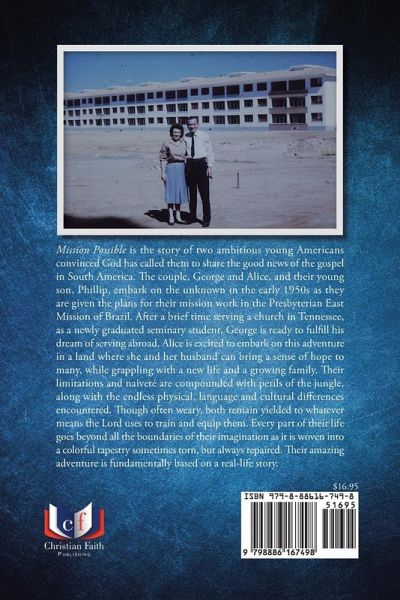 "Mission Possible" is the story of two ambitious young Americans convinced God has called them to share the good news of the gospel in South America. The couple, George and Alice, and their young son, Phillip, embark on the unknown in the early 1950s as they are given the plans for their mission work in the Presbyterian East Mission of Brazil. After a brief time serving a church in Tennessee, as a newly graduated seminary student, George is ready to fulfill his dream of serving abroad. Alice is excited to embark on this adventure in a land where she and her husband can bring a sense of hope to many, while grappling with a new life and a growing family. Their limitations and naivete are compounded with perils of the jungle, along with the endless physical, language and cultural differences encountered. Though often weary, both remain yielded to whatever means the Lord uses to train and equip them. Every part of their life goes beyond all the boundaries of their imagination as it is woven into a colorful tapestry sometimes torn, but always repaired. Their amazing adventure is fundamentally based on a real-life story.