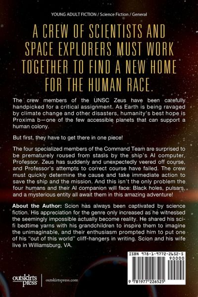The crew members of the UNSC Zeus have been carefully handpicked for a critical assignment. As Earth is being ravaged by climate change and other disasters, humanity’s best hope is Proxima b—one of the few accessible planets that can support a human colony. But first, they have to get there in one piece! The four specialized members of the Command Team are surprised to be prematurely roused from stasis by the ship’s AI computer, Professor. Zeus has suddenly and unexpectedly veered off course, and Professor’s attempts to correct course have failed. The crew must quickly determine the cause and take immediate action to save the ship and the mission. And this isn’t the only problem the four humans and their AI companion will face: Black holes, pulsars, and a mysterious entity all await them in this amazing adventure!
