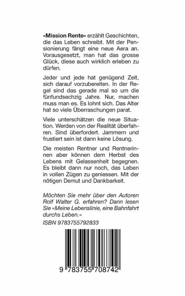 "Mission Rente" erzählt Geschichten, die das Leben schreibt. Mit der Pensionierung fängt eine neue Aera an. Vorausgesetzt, man hat das grosse Glück, diese auch wirklich erleben zu dürfen.Jeder und jede hat genügend Zeit, sich darauf vorzubereiten. In der Regel sind das gerade mal so um die fünfundsechzig Jahre. Nur, machen muss man es. Es lohnt sich. Das Alter hat so viele Überraschungen parat. Viele unterschätzen die neue Situation. Werden von der Realität überfahren. Sind berfordert. Jammern und frustiert sein ist dann keine Lösung.Die meisten Rentner und Rentnerinnen aber können dem Herbst des Lebens mit Gelassenheit begegnen. Es bleibt dann nur noch, das Leben in vollen Zügen zu geniessen. Mit der nötigen Demut und Dankbarkeit.
