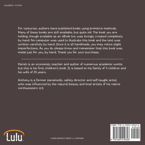 For centuries, authors have published books using primitive methods. Many of these books are still available, but quite old. The book you are holding, though available as an eBook too, was lovingly created completely by hand. No computer was used to illustrate this book and the text was written carefully by hand. Since it is all handmade, you may notice slight imperfections. As you do, please know and remember that this book was made just for you...by hand. Thank you for your purchase. Parish is an economist, teacher and author of numerous academic works but this is his first children's book. It is based on his family of 4 children and his wife of 20 years. Anthony is a former paramedic, safety director and self-taught artist who was influenced by the natural beauty and local artists of his native northwestern U.S.