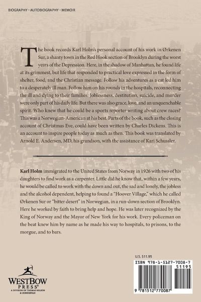 The book records Karl Holm's personal account of his work in Ørkenen Sur, a shanty town in the Red Hook section of Brooklyn during the worst years of the Depression. Here, in the shadow of Manhattan, he found life at its grimmest, but life that responded to practical love expressed in the form of shelter, food, and the Christian message. Follow his adventures as a cat led him to a desperately ill man. Follow him on his rounds in the hospitals, reconnecting the ill and dying to their families. Joblessness, destitution, suicide, and murder were only part of his daily life. But there was also grace, love, and an unquenchable spirit. Who knew that he could be a sports reporter writing about crew races? This was a Norwegian-American at his best. Parts of the book, such as the closing account of Christmas Eve, could have been written by Charles Dickens. This is an account to inspire people today as much as then. This book was translated by Arnold E. Andersen, MD, his grandson, with the assistance of Kari Schussler.