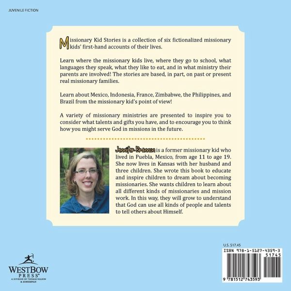 Missionary Kid Stories is a collection of six fictionalized missionary kids' first-hand accounts of their lives. Learn where the missionary kids live, where they go to school, what languages they speak, what they like to eat, and in what ministry their parents are involved! The stories are based, in part, on past or present real missionary families. Learn about Mexico, Indonesia, France, Zimbabwe, the Philippines, and Brazil from the missionary kid's point of view! A variety of missionary ministries are presented to inspire you to consider what talents and gifts you have, and to encourage you to think how you might serve God in missions in the future.