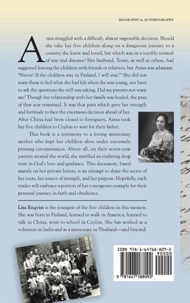This book is based on the private letters of a dedicated missionary mother who refused to leave her five children behind, even in dire circumstances. Her adventurous journey took them to China during dangerous war times, and other places around the world. Her youngest daughter shares the secret of her mother's enduring strength and committed purpose. This intriguing personal journey is an inspirational example of courage, faith, and obedience.