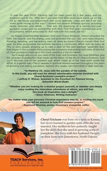 "It was the year 2000. Farming had not been good for a few years, and my husband said to me, 'Why don't you take that little seven-acre patch up on the hill by the house and experiment with some specialty crops and see if we can make some money in that way?' I looked into several different options, including herbs, lavender, and alfalfa. ... That was the beginning of a twenty-one-year pumpkin career and my partnership with God. That first year, I planted one acre of pumpkins, which amounted to 400 hills with five seeds per hill." So began a partnership between God and Cheryl Erickson. Cheryl provided the faith, the muscle, and the energy, and God provided the sun, rain, and many miracles. Planting, weeding, and harvesting were all done by hand-Cheryl's hands-that first year. As time progressed, harvesttime became a community effort with as many as fifty or sixty people showing up to take a spot on the well-planned "assembly line" that began in the pumpkin field picking the pumpkins and ending with rows of bins full of clean pumpkins lined up in the shed, awaiting a trip to market. You'll laugh and cry as you read of the trials and triumphs, the near-fatalities, and the miracles of protection that made up the fabric of the life of Cheryl Erickson. And you'll discover one of her greatest joys which made all of her hard work worth the effort. In a gentle way, Cheryl weaves in spiritual lessons learned throughout the years of growing and selling pumpkins-lessons the reader can internalize in their own life. "In Matthew 25, Jesus tells the parable of the talents. In this book, you will read the almost unbelievable miracles involved with Cheryl Erickson's pumpkin project." --Jeffrey K. Wilson, Assistant to the President for Planned Giving, Adventist World Radio "Whether you are looking for a mission project yourself, or whether you simply enjoy reading the miraculous adventures of others, you will find this book an inspiration and a delight." --Gwen Simmons. Writing Instructor "No matter what your personal Christian experience may be, in reading this book you will be amazed at how God answers prayers." --Raymond Woolsey, pastor, missionary evangelist, editor