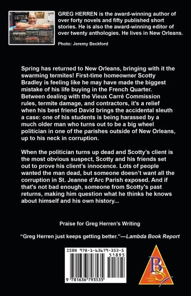 Spring has returned to New Orleans, bringing with it the swarming termites! First-time homeowner Scotty Bradley is feeling like he may have made the biggest mistake of his life buying in the French Quarter. Between dealing with the Vieux Carré Commission rules, termite damage, and contractors, it's a relief when his best friend David brings the accidental sleuth a case: one of his students is being harassed by a much older man who turns out to be a big wheel politician in one of the parishes outside of New Orleans, up to his neck in corruption. When the politician turns up dead and Scotty's client is the most obvious suspect, Scotty and his friends set out to prove his client's innocence. Lots of people wanted the man dead, but someone doesn't want all the corruption in St. Jeanne d'Arc Parish exposed. And if that's not bad enough, someone from Scotty's past returns, making him question what he thinks he knows about himself and his own history...