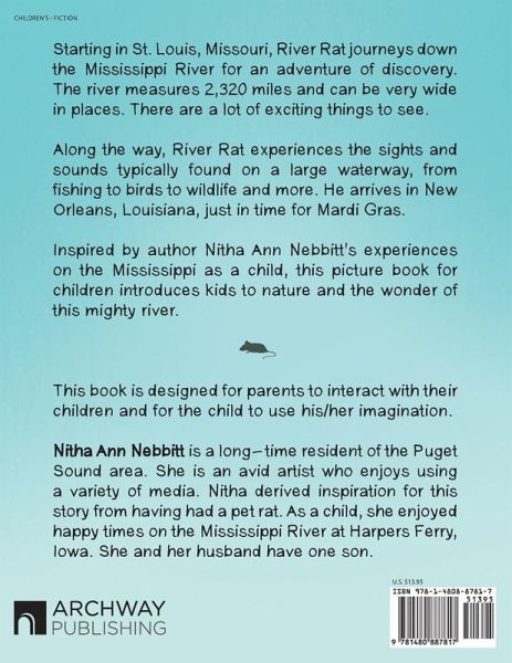 Starting in St. Louis, Missouri, River Rat journeys down the Mississippi River for an adventure of discovery. The river measures 2,320 miles and can be very wide in places. There are a lot of exciting things to see. Along the way, River Rat experiences the sights and sounds typically found on a large waterway, from fishing to birds to wildlife and more. He arrives in New Orleans, Louisiana, just in time for Mardi Gras. Inspired by author Nitha Ann Nebbitt's experiences on the Mississippi as a child, this picture book for children introduces kids to nature and the wonder of this mighty river.