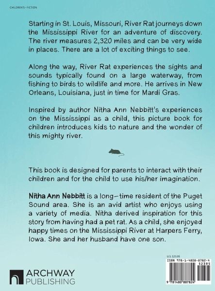 Starting in St. Louis, Missouri, River Rat journeys down the Mississippi River for an adventure of discovery. The river measures 2,320 miles and can be very wide in places. There are a lot of exciting things to see. Along the way, River Rat experiences the sights and sounds typically found on a large waterway, from fishing to birds to wildlife and more. He arrives in New Orleans, Louisiana, just in time for Mardi Gras. Inspired by author Nitha Ann Nebbitt's experiences on the Mississippi as a child, this picture book for children introduces kids to nature and the wonder of this mighty river.