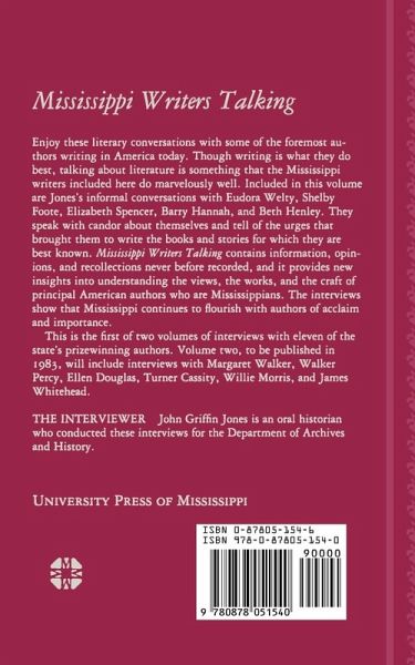 Enjoy these literary conversations with some of the foremost authors writing in America today. Though writing is what they do best, talking about literature is an act that the Mississippi writers included here do marvelously well. This is the first of two volumes of interviews with eleven of the state¿s prizewinning writers. This series shows that Mississippi continues to flourish with authors of importance and acclaim. Included in this first volume are Jones¿s informal conversations with Eudora Welty, Shelby Foote, Elizabeth Spencer, Barry Hannah, and Beth Henley. Mississippi Writers Talking provides new insights into understanding the views, the works, and the craft of principal American authors who are Mississippians. They speak with candor about themselves and tell of the urges that brought them to write the books and stories for which they are best known. Volume two includes interviews with Walker Percy, Margaret Walker, Ellen Douglas, Willie Morris, Turner Cassity, and
