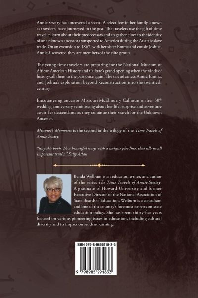 Missouri's Memories is the second in the trilogy of the Time Travels of Annie Sesstry, advancing the young time-travelers beyond America's Reconstruction era into the twentieth century. Annie, Emma, and Josh prepare for the National Museum of African American History and Culture grand opening when the winds of history catapult them to the past once again. Encountering their fourth generation great grandmother, Missouri McElmurry Calhoun on her 50th wedding anniversary reminiscing about her life, surprise and adventure await her descendants as they continue their search for an unknown ancestor brought to the shores of a fledgling nation generations earlier. An unexpected companion joins the young adventurers this time, blending the sweet marvels of coming of age with the challenges of navigating unfamiliar exploits. The remnants of the Red Summer and the impediments of Jim Crow once again expose the children to history lessons never imagined.