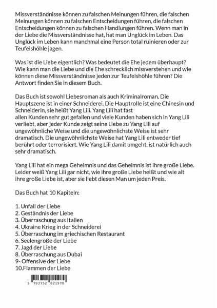 Missverständnisse können zu falschen Meinungen führen, die falschen Meinungen können zu falschen Entscheidungen führen, die falschen Entscheidungen können zu falschen Handlungen führen. Wenn man in der Liebe die Missverständnisse hat, hat man Unglück im Leben. Das Unglück im Leben kann manchmal eine Person total ruinieren oder zur Teufelshöhle jagen.Was ist die Liebe eigentlich? Was bedeutet die Ehe jedem überhaupt? Wie kann man die Liebe und die Ehe schrecklich missverstehen und wie können diese Missverständnisse jeden zur Teufelshöhle führen? Die Antwort finden Sie in diesem Buch.Das Buch ist sowohl Liebesroman als auch Kriminalroman. Die Hauptszene ist in einer Schneiderei. Die Hauptrolle ist eine Chinesin und Schneiderin, sie heißt Yang Lili. Yang Lili hat fastallen Kunden sehr gut gefallen und viele Kunden haben sich in Yang Lili verliebt, aber jeder Kunde zeigt seine Liebe zu Yang Lili auf ungewöhnliche Weise und die ungewöhnlichste Weise ist sehr dramatisch. Die ungewöhnlichste Weise hat Yang Lili entweder tief berührt oder terrorisiert. Wie Yang Lili damit umgeht, ist natürlich auch sehr dramatisch.Yang Lili hat ein mega Geheimnis und das Geheimnis ist ihre große Liebe. Leider weiß Yang Lili gar nicht, wie ihre große Liebe heißt und wie alt ihre große Liebe ist, aber sie liebt diesen Man um jeden Preis.Das Buch hat 10 Kapiteln:1. Unfall der Liebe2. Geständnis der Liebe3. Überraschung aus Italien4. Ukraine Krieg in der Schneiderei5. Überraschung im griechischen Restaurant6. Seelengröße der Liebe7. Jagd der Liebe8. Überraschung aus Dubai9- Offensive der Liebe10.Flammen der Liebe