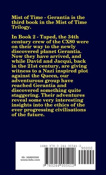 Mist of Time - Gerantia is the third book in the Mist of Time Trilogy. In Book 2 - Taped, the 34th century crew of the CX80 were on their way to the newly discovered planet Gerantia. Now they have arrived, and while David and Jacqui, back in the 21st century, are giving witness to a Nazi inspired plot against the Queen, our adventurous group have reached Gerantia and discovered something quite staggering. Their adventures reveal some very interesting insights into the ethics of the ever progressing civilisations of the future.