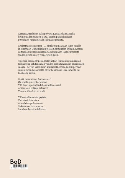 Kerron Anttalaisen sukupolvista Karjalankannaksella kolmensadan vuoden ajalta. Esitän paljon kuvioita perheiden rakenteista ja sukulaissuhteista. Ensimmäisessä osassa (¿ sisällöstä) palataan 1600-luvulle ja siirrytään Uudenkirkon pitäjän Anttanalan kylään. Kerron seitsemästä pääsukuhaarasta sekä niiden jakautumisesta Uudenkirkon ja sen ympäristön kyliin. Toisessa osassa (¿ sisällöstä) jatkan Hännilän sukuhaaran tarkastelua kahdensadan vuoden ajalta talvisodan alkamiseen saakka. Kerron koko kylän asukkaista, koska kaikki perheet sukunimeen katsomatta olivat keskenään joko läheistä tai kaukaista sukua. Mistä polveutuvat Anttalaiset? On meillä juuret karjalaiset Yllö Laurinpoika Uudellakirkolla asusteli Anttanalan polkuja tallusteli Vuonna 1669 hän vielä eli Yllön vanhimmista pojista Esi-isistä ikiomista Anttalaiset polveutuvat Sukujuuret haarautuvat Luodaan heistä mielikuvat