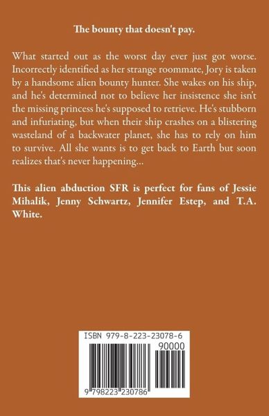 The bounty that doesn't pay. What started out as the worst day ever just got worse. Incorrectly identified as her strange roommate, Jory is taken by a handsome alien bounty hunter. She wakes on his ship, and he's determined not to believe her insistence she isn't the missing princess he's supposed to retrieve. He's stubborn and infuriating, but when their ship crashes on a blistering wasteland of a backwater planet, she has to rely on him to survive. All she wants is to get back to Earth but soon realizes that's never happening… This alien abduction SFR is perfect for fans of Jessie Mihalik, Jenny Schwartz, Jennifer Estep, and T.A. White. Please note this is a revised version of a SFR title that's been modified to remove most of the adult content besides some tension and fade-to-black moments and is more SF than SFR. If you'd prefer the original spicy version, look for "Princess By Mistake."