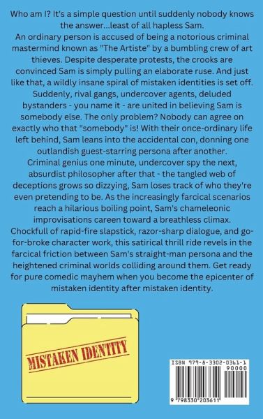 "Who am I? It's a simple question, until suddenly nobody knows the answer...least of all me!" Just ask Sam, an ordinary person who woke up one day to find their life has become an out-of-control freight train of missed-taken identities, improvisational deceptions, and rapidly escalating chaos. It all started when Sam was mistakenly accused of being a notorious criminal mastermind known as "The Artiste" by an overzealous crew of art thieves. Despite Sam's desperate attempts to set the record straight, the crooks are convinced their elusive leader is simply playing an elaborate ruse. And just like that, a wildly insane spiral is set off - one where Sam becomes a lightning rod of improbable misunderstandings and baffling impostor accusations. Suddenly multiple factions from rival gangs to undercover agents to deluded bystanders are united in the belief that Sam is somebody else...it's just that nobody can agree on exactly who that "somebody else" actually is! With their once-ordinary life in the rearview mirror, Sam has no choice but to lean into the accidental con and embark on a tour-de-force of panicked improvisations, juggling one wildly varied "guest starring" persona after another. One minute they're playing the criminal genius Artiste, the next they're bluffing as an undercover spy, then they're inhabiting an absurdist philosopher's cryptic ramblings, then they're embodying a tough-talking gangster, then a hapless civilian, and on and on the dizzying spiral goes. Narrated through Sam's chameleon-like lens, this satirical comedy is a laugh-a-minute thrill ride that revels in the farcical friction between their bumbling straight-man persona and the heightened criminal worlds they continuously find themselves embroiled within. As Sam's tangled web of deceptions threatens to unravel in each frantic chapter, the desperate improv and breathless pace keep the laughs and whiplash of identities constantly spinning. Written with a furiously witty splendor, chockfull of rapid-fire slapstick, crackling dialogue, and go-for-broke character work, this audacious novel answers the ultimate comedic question - what happens when you become the epicenter of a calamitous collision of mistaken identity after mistaken identity? The answer is pure, farcical mayhem that will leave you gasping for air...and another hilarious persona!