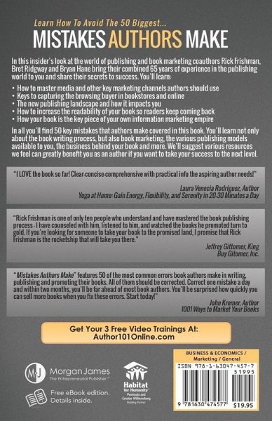 Section 1 -- Before You Write Mistake #1 Believing You Can't Write a Book Mistake #2 Writing a Book for the Wrong Reason Mistake #3 No Real Understanding of Your Target Market Mistake #4 Expecting Instant Success Mistake #5 No Understanding of the Various Publishing Models Mistake #6 Lack of Perception of Perceived Value in Information Marketing Mistake #7 Trying to do Too Many Products at the Same Time Section 2 -- The Business of Your Book Mistake #8 Overproducing on an Initial Book Launch to Lower Per Unit Cost Mistake #9 Not Understanding the Lifetime Value of a Reader Mistake #10 You Don t Know Your Numbers Mistake #11 Not Knowing How Bookstores Really Work Mistake #12 Trying to Wear Too Many Hats Mistake #13 Not Understanding the Differences Between a Distributor and a Wholesaler and a Fulfillment House Mistake #14 Not Using a Literary Agent When You Need One and Using One When You Don t Mistake #15 Not Understanding Your Rights Mistake #16 Failure to Register Your Copyright Mistake #17 Expecting Other People to Do It for You Mistake #18 No Commitment to Continual Learning Mistake #19 No Continuity Revenue Section 3 -- Writing Your Book Mistake #20 Writing a Crappy Book Mistake #21 Poor Book Title Mistake #22 Bad Cover Design Mistake #23 Writing a Book that is Not Easily Consumable Mistake #24 Poor Interior Layout Mistake #25 No Name Capture Mechanisms Built Into Your Book Mistake #26 No Branding Mistake #27 Doing an Ebook Only Mistake #28 Forgetting to Put Disclosures/Disclaimers in Your Book Section 4 -- Marketing Your Book Before It s Written Mistake #29 Failure to Develop a Book Proposal/Book Business Plan Mistake #30 No List Building Efforts in Advance of Book Publication Mistake #31 No On-going Communication with the Lists You're Building Mistake #32 No On-going Commitment to Marketing Mistake #33 Not Using Social Media Properly Mistake #34 Lack of a Press Kit Mistake #35 Lack of a Blog Mistake #36 Not Attending Live Events to Network Mistake #37 Not Owning Some Key Web Properties Mistake #38 No Understanding of How One Achieves Bestseller Status Mistake #39 You Can Write a Book but You Can t Write Sales Copy Section 5 -- Marketing Your Book After It s Written Mistake #40 Not Using Public Speaking to Build Your Platform Mistake #41 Becoming a Media Diva Mistake #42 Not Being Ready for the Big Stage Mistake #43 Underestimating the Power of Radio Mistake #44 Not Leveraging the Full Power of Amazon Mistake #45 Not Getting the Most Out of Book Signings Mistake #46 Incomplete Profile Pages in Your Distribution Channels Mistake #47 Underestimating the Value of Book Reviews Mistake #48 Not Capturing the Browsing Buyer Mistake #49 No Use of Video in Your Marketing Efforts Mistake #50 Afraid to Give Books Away