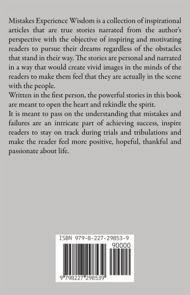 Mistakes Experience Wisdom is a collection of inspirational articles that are true stories narrated from the author's perspective with the objective of inspiring and motivating readers to pursue their dreams regardless of the obstacles that stand in their way. The stories are personal and narrated in a way that would create vivid images in the minds of the readers to make them feel that they are actually in the scene with the people. Written in the first person, the powerful stories in this book are meant to open the heart and rekindle the spirit. It is meant to pass on the understanding that mistakes and failures are an intricate part of achieving success, inspire readers to stay on track during trials and tribulations and make the reader feel more positive, hopeful, thankful and passionate about life.