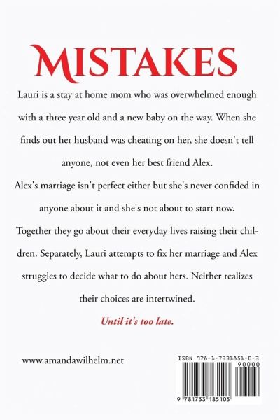 Lauri is a stay at home mom who was overwhelmed enough with a three year old and a new baby on the way. When she finds out her husband was cheating on her, she doesn't tell anyone, not even her best friend Alex. Alex's marriage isn't perfect either but she's never confided in anyone about it and she's not about to start now. Together they go about their everyday lives raising their children. Separately, Lauri attempts to fix her marriage and Alex struggles to decide what to do about hers. Neither realizes their choices are intertwined. Until it's too late.