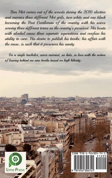 Bon Mot comes out of the woods during the 2016 election and marries three different Mot girls, two white and one black becoming the First Gentleman of the country with his wives serving three different terms as the country's president. His bouts with alcohol cause three separate separations and confuse his ability to care. His desire to publish his books, his affair with the muse, is such that it preserves his sanity.
