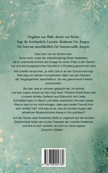 Umgeben von Wald, abseits von Berlin, liegt die beschauliche Licentia-Akademie für Jungen. Ein Internat ausschließlich für homosexuelle Jungen.Das kann nur ein Scherz sein.Ist es nicht, muss der siebzehnjährige Brian feststellen, als er unerwartet schnell die Zusage für einen Platz in der Tasche hat und dort ausgesprochen freundlich in Empfang genommen wird. Alle Zweifel verrauchen, je mehr Zeit er an der Schule verbringt. Weit weg von seinem homophoben Vater und den Geistern der Vergangenheit, beschließt er, die neu gewonnene Freiheit auszukosten. Bis das, was er verloren geglaubt hat, ihn einholt und sein Leben erneut auf den Kopf stellt. Plötzlich findet Brian sich in einem dichten Geflecht aus Eifersucht und Liebe, Schmetterlingen im Bauch und tiefen seelischen Wunden wieder. Warum kann er es nicht ertragen, dass sein bester Freund Aron sich verliebt hat? Und was ist es, dass die dunklen Augen des attraktiven Musterschülers Alexej in ihm auslösen? Auf der Suche nach Antwortenstößt er ungewollt auf die dunklen Geheimnisse hinter der bunten Fassade der Licentia-Akademie, und ehe er sich versieht, ist nicht nur seine eigene Zukunft in Gefahr...