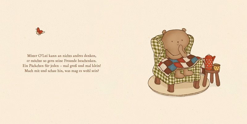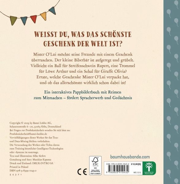 Eine niedliche Geschichte über die wirklich wichtigen Geschenke im Leben: Freunde!Mister O'Lui möchte so gern allen seinen Freunden etwas schenken! Der kleine Biberbär ist ganz aufgeregt und grübelt. Er möchte das allerschönste Geschenk der Welt verschenken. So bekommt Streifenschwein Rupert einen Ball, Arthur Löwe eine Trommel und Olivia Giraffe einen Schal. Doch war das schönste Geschenk schon dabei? Und worüber würde sich Mister O'Lui wohl am meisten freuen? Finde es gemeinsam mit dem Biberbären heraus und errate, welche Geschenke hier verpackt wurden - und was wohl das allerschönste Geschenk der Welt sein könnte. - Fördert Spracherwerb: Der einfach gereimte Text lädt zum Mitsprechen ein.- Fördert Aufmerksamkeit und Kreativität: Auf jeder Seite muss mithilfe einfacher Reime ein Gegenstand erraten werden. - Für Kinder ab 2 Jahren: Robustes Pappbilderbuch mit liebevollen Illustrationen für Kleinkinder.