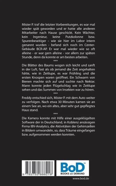 Mister P. traf die letzten Vorbereitungen, es war mal wieder spät geworden und er hatte alle anderen Mitarbeiter nach Hause geschickt. Kein Wächter, kein Ingenieur, keine Putzkolonne bzw. Spurenbeseitiger - wie sie hier im Labor intern genannt wurden - befand sich noch im Center-Gebäude BCR-AP. Er war mal wieder wie so oft alleine - er war gern alleine - vor allem zur späten Stunde, denn da konnte er am besten arbeiten. ___Die Blätter des Baums wogen sich leicht und sanft in der Luft, fast als ob jemand die Zeit angehalten hätte, wie in Zeitlupe, es war Frühling und die ersten Knospen waren geöffnet. Ein Schwarm von Bienen machte sich auf und suchte nach Nektar. Mann konnte jeden Flügelschlag wie in Zeitlupe sehen und das Summen von Insekten war fast zu hören, in der Ferne hörte man das Geschrei einer Krähe. ___Freddy entschied sich Mister P. mit dem Auto weiter zu verfolgen. Nach etwa 30 Minutenkamen Sie an einem See an, wo ein altes aber sehr gut gepflegtes Haus stand. ___Die Kamera konnte mit Hilfe einer ausgeklügelten Software der in Deutschland, in Koblenz ansässigen Firma IBV-Analytics, die Aktivitäten der Gehirnzellen in Bildern umwandeln, so, dass Träume eingefangen bzw. aufgenommen werden konnten.