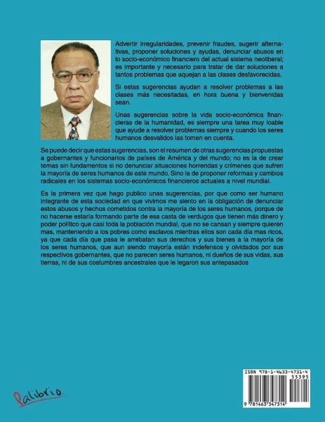 Advertir irregularidades, prevenir fraudes, sugerir alternativas, proponer soluciones y ayudas, denunciar abusos en lo socio-económico financiero del actual sistema neoliberal; es importante y necesario para tratar de dar soluciones a tantos problemas que aquejan a las clases desfavorecidas. Si estas sugerencias ayudan a resolver problemas a las clases más necesitadas, en hora buena y bienvenidas sean. Unas sugerencias sobre la vida socio-económica financieras de la humanidad, es siempre una tarea muy loable que ayude a resolver problemas siempre y cuando los seres humanos desvalidos las tomen en cuenta. Se puede decir que estas sugerencias, son el resumen de otras sugerencias propuestas a gobernantes y funcionarios de países de América y del mundo; no es la de crear temas sin fundamentos si no denunciar situaciones horrendas y crímenes que sufren la mayoría de seres humanos de este mundo. Sino la de proponer reformas y cambios radicales en los sistemas socio-económicos financieros actuales a nivel mundial. Es la primera vez que hago publico unas sugerencias, por que como ser humano integrante de esta sociedad en que vivimos me siento en la obligación de denunciar estos abusos y hechos cometidos contra la mayoría de los seres humanos, porque de no hacerse estaría formando parte de esa casta de verdugos que tienen más dinero y poder político que casi toda la población mundial, que no se cansan y siempre quieren mas, manteniendo a los pobres como esclavos mientras ellos son cada día mas ricos, ya que cada día que pasa le arrebatan sus derechos y sus bienes a la mayoría de los seres humanos, que aun siendo mayoría están indefensos y olvidados por sus respectivos gobernantes, que no parecen seres humanos, ni dueños de sus vidas, sus tierras, ni de sus costumbres ancestrales que le legaron sus antepasados