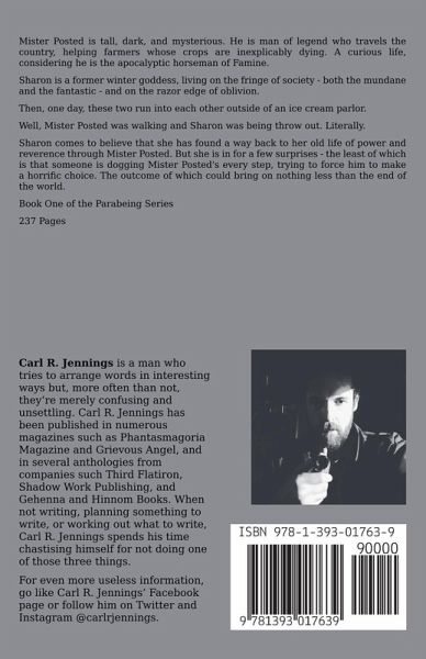 Mister Posted is tall, dark, and mysterious. He is man of legend who travels the country, helping farmers whose crops are inexplicably dying. A curious life, considering he is the apocalyptic horseman of Famine. Sharon is a former winter goddess, living on the fringe of society - both the mundane and the fantastic - and on the razor edge of oblivion. Then, one day, these two run into each other outside of an ice cream parlor. Well, Mister Posted was walking and Sharon was being throw out. Literally. Sharon comes to believe that she has found a way back to her old life of power and reverence through Mister Posted. But she is in for a few surprises - the least of which is that someone is dogging Mister Posted's every step, trying to force him to make a horrific choice. The outcome of which could bring on nothing less than the end of the world. Book One of the Parabeing Series 237 Pages