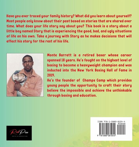 Have you ever traced your family history? What did you learn about yourself? Most people only know about their past based on stories that are shared over time. What does your life story say about you? This book is a story about a little boy named Story that is experiencing the good, bad, and ugly situations of life on his own. Take a journey with Story as he makes decisions that will effect his story for the rest of his life. Monte Barrett is a retired boxer whose career spanned 18 years. He's fought on the highest level of boxing to become a heavyweight champion and was inducted into the New York Boxing Hall of Fame in 2019. He's the founder of Champs Camp which provides young people the opportunity to craft their story believe the impossible and achieve the unthinkable through boxing and education.