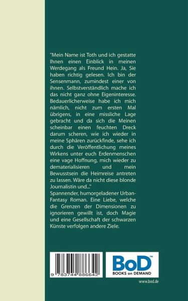 Mein Name ist Toth, Vincent Toth und ich gestatte Ihnen einen Einblick in meinen persönlichen Werdegang als Freund Hein. Ja, Sie haben richtig gelesen. Ich bin der sogenannte Sensenmann, zumindest einer von ihnen. Selbstverständlich mache ich das nicht ganz ohne Eigeninteresse. Bedauerlicherweise habe ich mich nämlich, nicht zum ersten Mal übrigens, in eine missliche Lage gebracht und da sich die Meinen scheinbar einen feuchten Dreck darum scheren, wie ich wieder in meine Sphären zurückfinde, sehe ich durch die Veröffentlichung meines Wirkens unter euch Erdenmenschen eine vage Hoffnung, mich wieder zu dematerialisieren und mein Bewusstsein die Heimreise antreten zu lassen. Wäre da nicht diese blonde Journalistin. Ein spannender, humorgeladener Urban-Fantasy-Roman. Eine Liebe, welche die Grenzen der Dimensionen zu ignorieren gewillt ist, doch magische Kräfte und eine Gesellschaft der schwarzen Künste verfolgen andere Ziele. Nach seinem erfolgreichen Debüt, mit dem Sf MysteryThriller Phase 7: Der Schöpfermythos, bedient John D. Sikavica nun die Liebhaber des Fantasy Genres.
