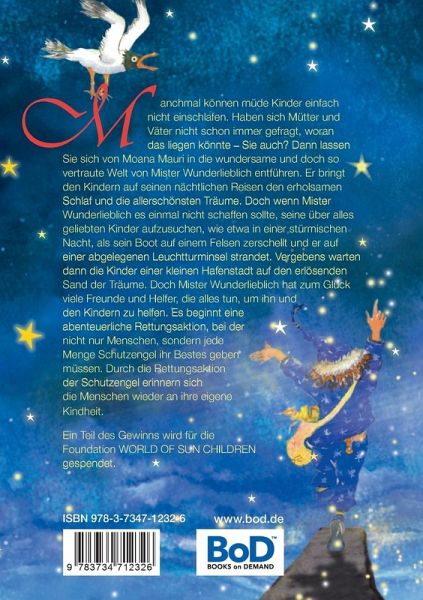 Manchmal können müde Kinder einfach nicht einschlafen. Haben sich Mütter und Väter nicht schon immer gefragt, woran das liegen könnte - Sie auch? Dann lassen Sie sich von Moana Mauri in die wundersame und doch so vertraute Welt von Mister Wunderlieblich entführen. Er bringt den Kindern auf seinen nächtlichen Reisen den erholsamen Schlaf und die allerschönsten Träume. Doch wenn Mister Wunderlieblich es einmal nicht schaffen sollte, seine über alles geliebten Kinder aufzusuchen, wie etwa in einer stürmischen Nacht, als sein Boot auf einem Felsen zerschellt und er auf einer abgelegenen Leuchtturminsel strandet. Vergebens warten dann die Kinder einer kleinen Hafenstadt auf den erlösenden Sand der Träume. Doch Mister Wunderlieblich hat zum Glück viele Freunde und Helfer, die alles tun, um ihn und den Kindern zu helfen. Es beginnt eine abenteuerliche Rettungsaktion, bei der nicht nur Menschen, sondern jede Menge Schutzengel ihr Bestes geben müssen. Durch die Rettungsaktion der Schutzengel erinnern sich die Menschen wieder an ihre eigene Kindheit.Ein Teil des Gewinns wird für die Foundation WORLD OF SUN CHILDREN gespendet.