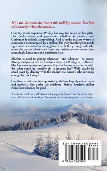 He's the last man she wants this holiday season. Too bad he's exactly what she needs... Country music superstar Presley has way too much on her plate. Her performance and promotion schedule is packed, and Christmas is quickly approaching. And to make matters worse, it seems she's been targeted by a stalker. The very last thing she needs right now is a romantic entanglement with the grumpy jerk who owns the casino where she's taken up residence--no matter how annoyingly handsome and persistent he is. Markus is used to getting whatever--and whoever--he wants. Money and power can do that for a man. But Presley is...different. She has more money and power than she knows what to do with. So, what could he possibly do to impress her? Well, maybe he could start by dealing with the stalker she doesn't take seriously enough for his liking... Can this pair of complete opposites grab their happily ever after--and maybe a kiss under the mistletoe--before Presley's stalker ruins their chances for good? Mistletoe and the Billionaire's Cowgirl is book 3 in the new, clean and wholesome, Cowboy Christmas contemporary romance series. Order today and let the festive holiday binge-reading begin.