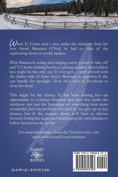 When Ty Evans stole a kiss under the mistletoe from his best friend Shannon O’Neil, he had no idea of the captivating desire it would awaken. With Shannon’s acting and singing career poised to take off and Ty’s horse training business gaining acclaim, that reckless kiss might be the only one Ty ever gets… until a brush with the darker side of fame forces Shannon to question if she can handle the spotlight. Now she’s back in Northstar to clear her head. This might be the chance Ty has been waiting for—an opportunity to convince Shannon that their kiss under the mistletoe was just the beginning of something even more wonderful. Just one problem. He can’t let her give up on her dreams, but if she pursues them, he’ll have to choose between losing her again and abandoning his own dreams to follow her across the world.