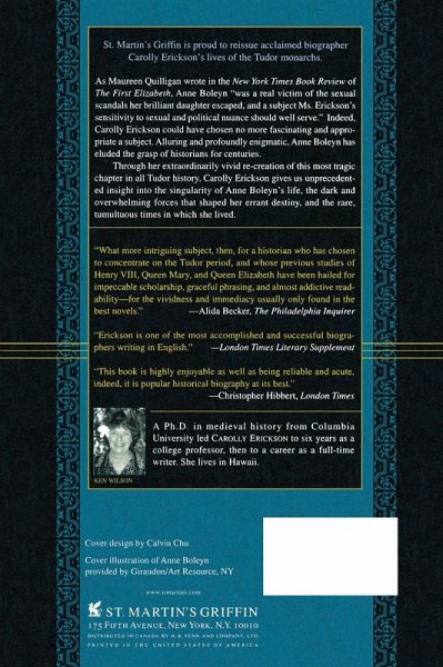 As Maureen Quilligan wrote in the New York Times Book Review of The First Elizabeth, Anne Boleyn "was a real victim of the sexual scandals her brilliant daughter escaped, and a subject Ms. Erickson's sensitivity to sexual and political nuance should well serve." Indeed, Carolly Erickson could have chosen no more fascinating and appropriate a subject. Alluring and profoundly enigmatic, Anne Boleyn has eluded the grasp of historians for centuries. Through her extraordinarily vivid re-creation of this most tragic chapter in all Tudor History, Carrolly Erickson gives us unprecedented insight into the singuarlity of Anne Boleyn's life, the dark and overwhelming forces that shaped her errant destiny, and the rare, tumultuous times in which she lived.