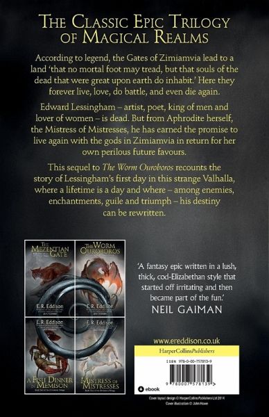 Eric Rucker Eddison was born in Adel, England, in 1882. His parents encouraged his spirited imagination. Boyhood days spent reading and adventuring in the northern English countryside with his constant companion, Arthur Ransome, provided rich material for his novels. Eddison was twice honoured, receiving the Order of St. Michael and St. George (1924) and the Order of the Bath (1929) for public service with the Board of Trade. His writings include the first complete translation of the Icelandic epic, Egil's Saga; the novels The Worm Oroboros and Stybiorn the Strong; and the trilogy Zimiamvia, including Mistress of Mistresses, A Fish Dinner in Memison, and the final book, The Mezentian Gate, which was left unfinished when he died suddenly of a stroke in 1945.