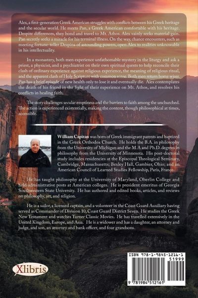 Alex, a first-generation Greek American struggles with conflicts between his Greek heritage and the secular world. He meets Pan, a Greek American comfortable with his heritage. Despite differences, they bond and travel to Mt. Athos. Alex vainly seeks material gain. Pan secretly seeks a miracle for his terminal illness. On the way, chance encounters, such as meeting fortune-teller Despina of astounding powers, open Alex to realities unknowable in his intellectuality. In a monastery, both men experience unfathomable mystery in the liturgy and ask a priest, a physicist, and a psychiatrist on their own spiritual quests to help reconcile their clash of ordinary experience against religious experience, the meaning of religious ritual, and the apparent clash of Holy Scripture with common sense. Both men return home wiser. Pan has a brief episode of new health only to lose it and eventually die. Alex contemplates the death of his friend in the light of their experience on Mt. Athos, and resolves his conflicts in healing faith. The story challenges secular emptiness and the barriers to faith among the unchurched. The action is experienced existentially, making the content, though philosophical at times, accessible.