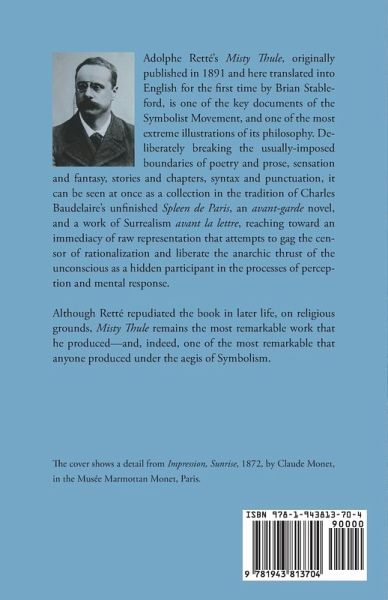 Adolphe Retté’s Misty Thule, originally published in 1891 and here translated into English for the first time by Brian Stable-ford, is one of the key documents of the Symbolist Movement, and one of the most extreme illustrations of its philosophy. Deliberately breaking the usually-imposed boundaries of poetry and prose, sensation and fantasy, stories and chapters, syntax and punctuation, it can be seen at once as a collection in the tradition of Charles Baudelaire’s unfinished Spleen de Paris, an avant-garde novel, and a work of Surrealism avant la lettre, reaching toward an immediacy of raw representation that attempts to gag the censor of rationalization and liberate the anarchic thrust of the unconscious as a hidden participant in the processes of perception and mental response. Although Retté repudiated the book in later life, on religious grounds, Misty Thule remains the most remarkable work that he produced—and, indeed, one of the most remarkable that anyone produced under the aegis of Symbolism.