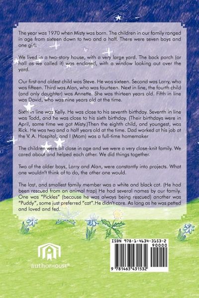 The year was 1970 when Misty was born. The children in our family ranged in age from sixteen down to two and a half. There were seven boys and one girl. We lived in a two-story house, with a very large yard. The back porch (or hall as we called it) was enclosed, with a window looking out over the yard. Our first and oldest child was Steve. He was sixteen. Second was Larry, who was fifteen. Third was Alan, who was fourteen. Next in line, the fourth child (and only daughter) was Annette. She was thirteen years old. Fifth in line was David, who was nine years old at the time. Sixth in line was Kelly. He was close to his seventh birthday. Seventh in line was Todd, and he was close to his sixth birthday. (Their birthdays were in April, same time we got Misty.)Then the eighth child, and youngest, was Rick. He was two and a half years old at the time. Dad worked at his job at the V. A. Hospital, and I (Mom) was a full-time homemaker The children were all close in age and we were a very close-knit family. We cared about and helped each other. We did things together. Two of the older boys, Larry and Alan, were constantly into projects. What one wouldn't think of to do, the other one would. The last, and smallest family member was a white and black cat. (He had been rescued from an animal trap) He had several names by our family. One was "Pickles" (because he was always being rescued) another was "Puddy", some just preferred "cat".He didn't care. As long as he was petted and loved and fed.