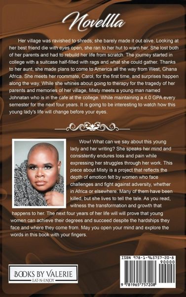 Misty's journey is a testament to the resilience of the human spirit. Born from the ashes of her tragic past in Ghana, West Africa where she witnessed the loss of her entire village and parents, Misty's journey to college in a foreign land was marked by unwavering determination. Each challenge she faced-whether grappling with the emotional scars of her past, maintaining a perfect GPA to secure her scholarship, or navigating the complexities of relationships-was met with a strength that belied her years. College life brought its own set of trials. Therapy sessions with Carol became a lifeline, guiding Misty through the entanglement of grief and self-discovery. Their bond grew deeper as Misty shared her fears and triumphs, finding solace in Carol's wisdom and empathy. The academic demands only intensified her resolve, transforming her into a beacon of resilience for her peers and a symbol of hope for those who knew her story. The pivotal moment in Misty's journey came during her junior year, when a brief encounter with Johnatan threatened to unravel everything, she had worked for. The fear of an unplanned pregnancy shook Misty to her core, forcing her to confront not just her feelings for Johnatan but also her deepest insecurities. Yet, through this moment of crisis, Misty emerged stronger, vowing to never compromise her dreams again. As graduation neared, Misty stood at a crossroads. With only a few credits standing between her and her degree, she faced the daunting reality of homelessness once she left campus. The choice between staying with Carol, her steadfast confidante, or embracing a new life with Johnatan and his family loomed large. It was a decision that would shape her future and define the depth of her resilience. In the final chapter of her college saga, Misty's heart found clarity amidst the uncertainty. Surrounded by the love of her therapy group, the unwavering support of Johnatan's family, and the bittersweet farewell to Carol, Misty made her choice. She chose love, not just for Johnatan but for herself-a love that promised stability, partnership, and a future filled with possibilities.